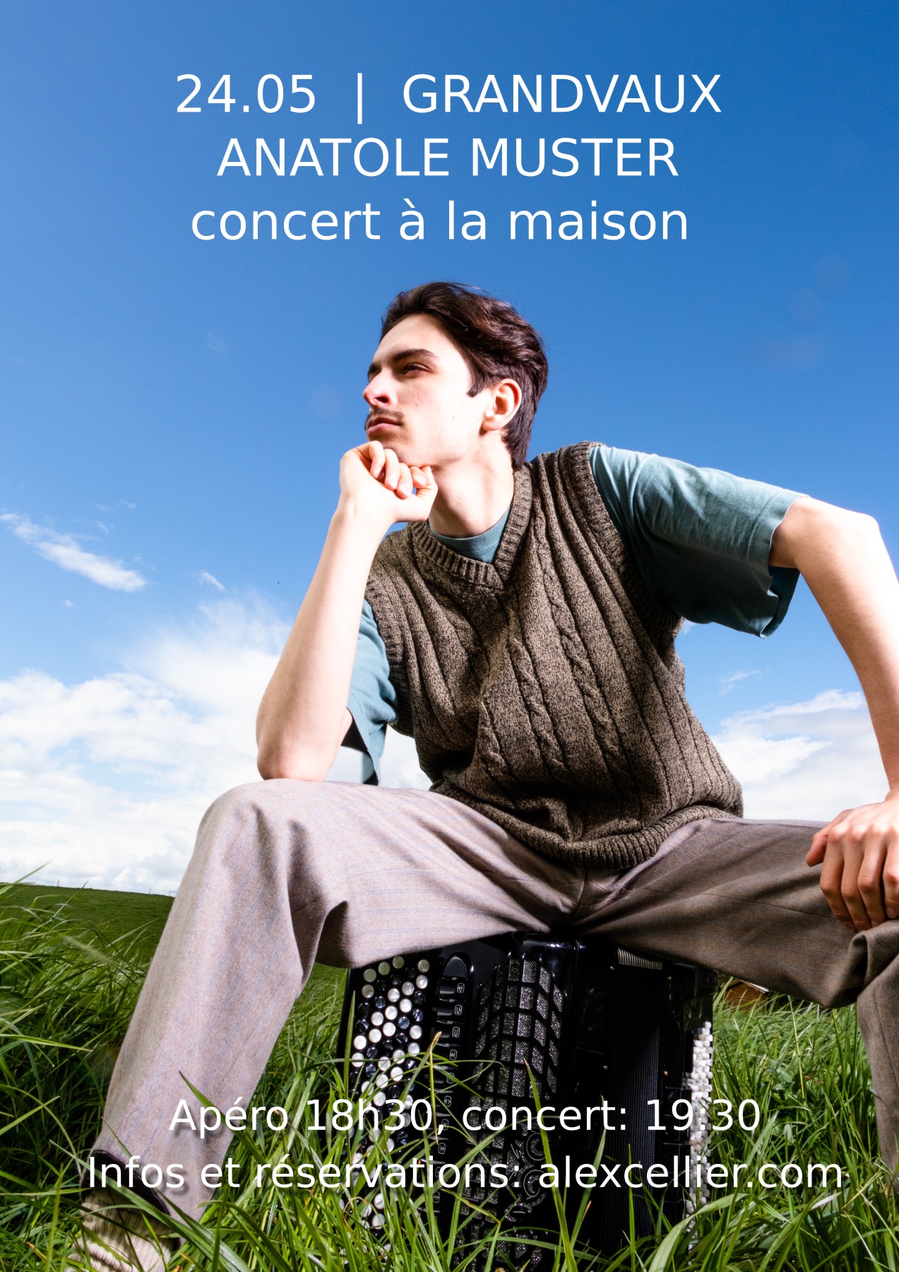 Anatole Muster (concert à la maison)24 mai 2026, 18:30 – 22:30Bourg-en-Lavaux, Rte de Crétaz 36, 1091 Grandvaux, Suisse